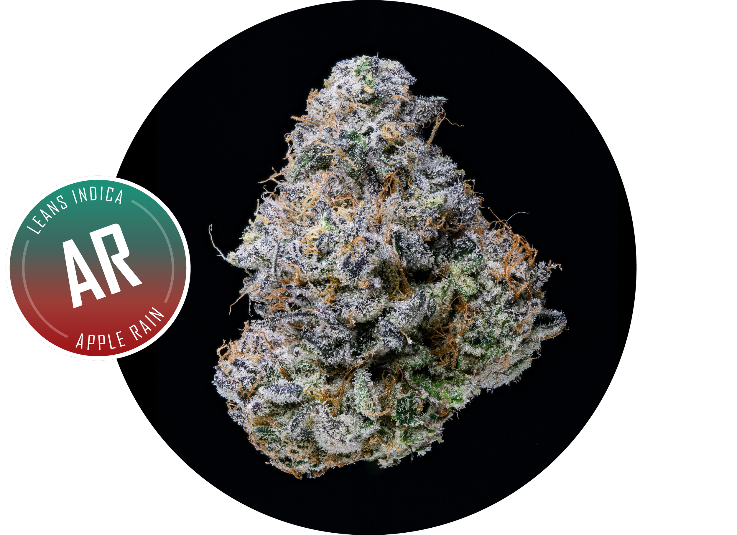 The Apple Rain is the latest strain debut from our in-house breeding program. Its lineage is a cross of [Apple Fritter x Rainbow belts] and the result is a stunning Indica leaning hybrid. Apple Fritter from Lumpy’s is a seamlessly complimented cross of sweet & earthy gas. It sports frosty light green colas with deep gassy earth & sweet apple-like notes. Rainbow Belts 3.0 is celebrated for its sweet, candy-like flavor profile combined with a relaxing euphoric and also sometimes sedating body high. If you’re a fan of Zkittlez, you’ll enjoy Rainbow Belts.