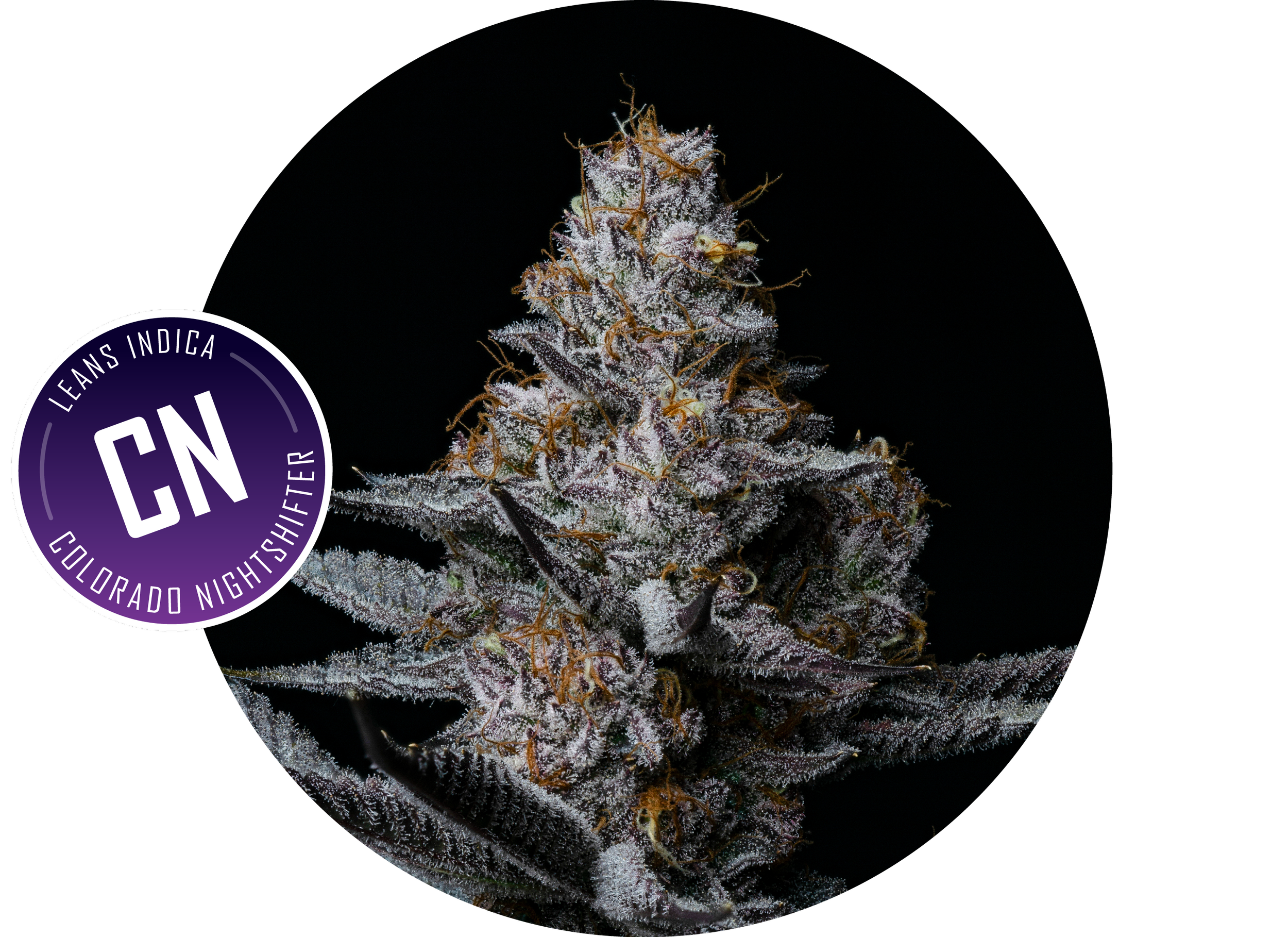 Originally bred by Relentless, the Colorado Nightshifter is an indica-dominant hybrid with a parent cross of [Trop Cherry x Frozay 94]. The nugs are a deep purple with vibrant orange hairs, packed with trichomes.The aroma is fruity syrup with undertones of sweet citrus.